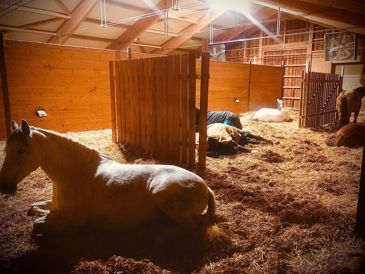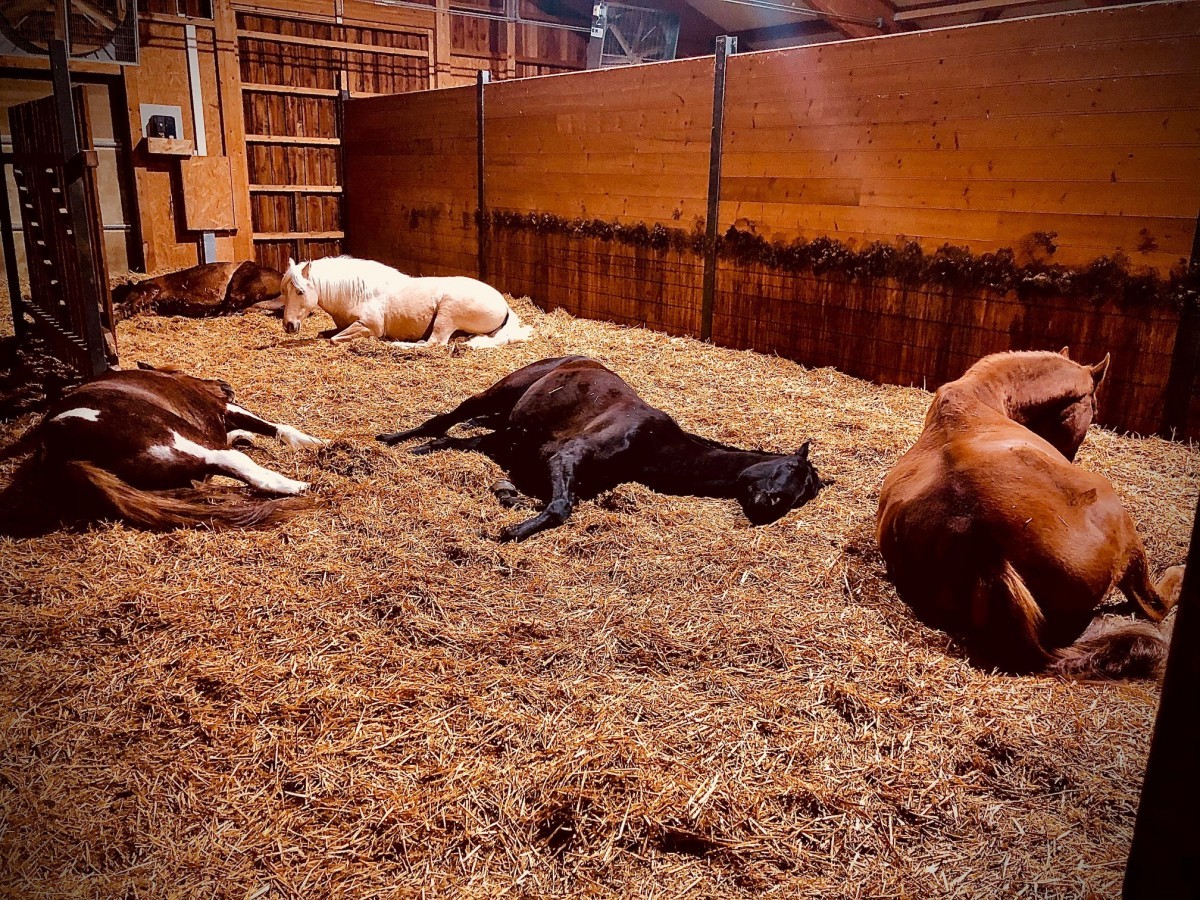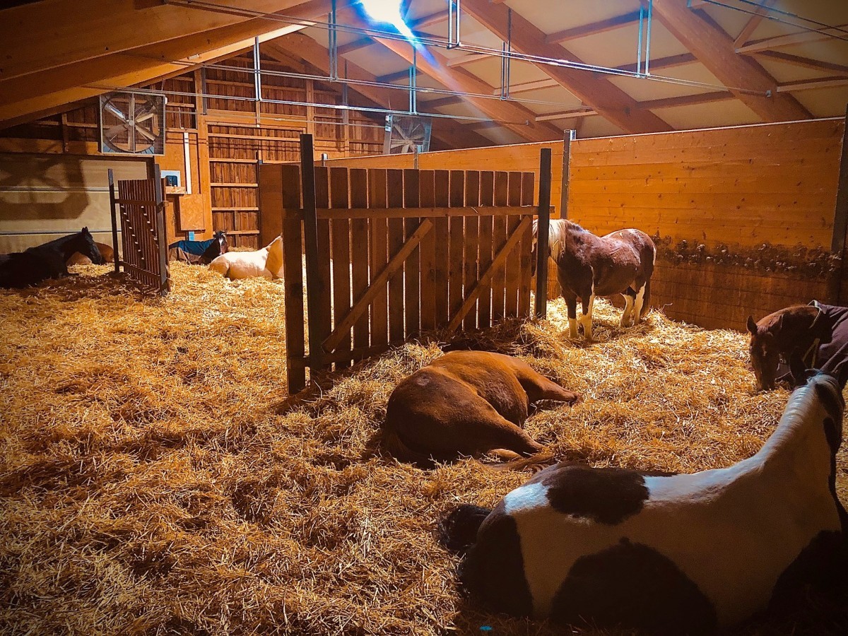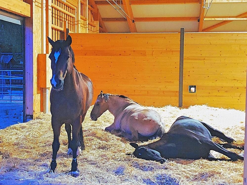 Da viele Pferde mit dem Material Grünkompost nicht vertraut sind, bzw. keine Erfahrung damit haben, nahmen sie dieses Material als Matratze schlecht an. Das war der Grund für uns die Matratze mit Stroh zu überdecken. Somit haben die Pferde eine grosse Fläche an zusätzlichen Beschäftigung, sowie eine angenehme und bekannte Liegefläche zur Verfügung.