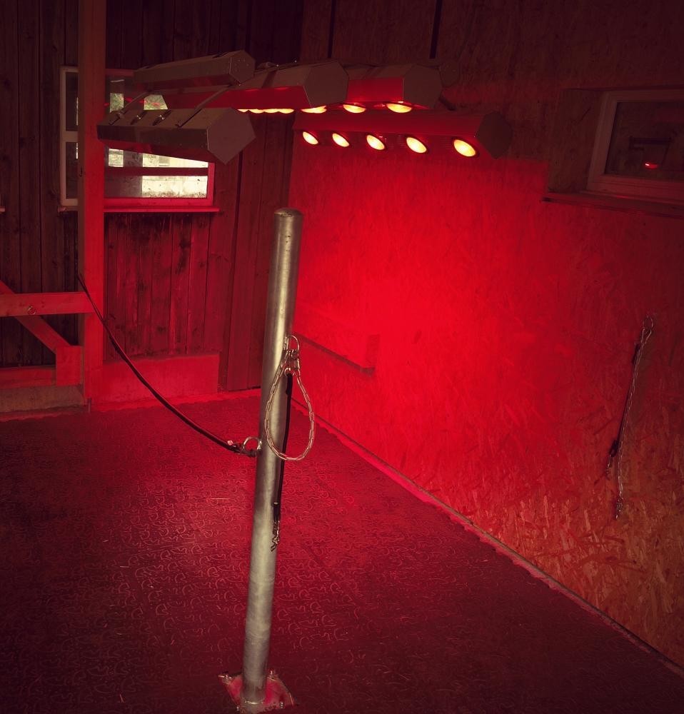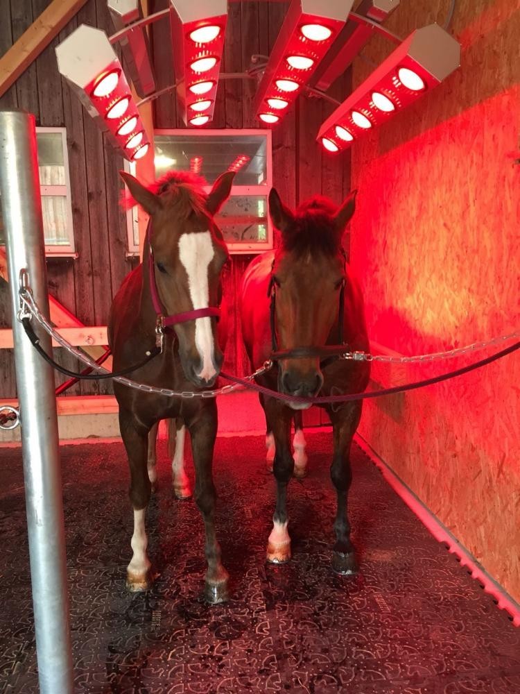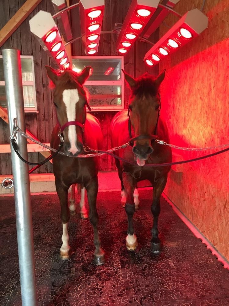 Beim Putzplatz des Neubaus ist das Infrarot Solarium instaliert. Dieses ist automatisch höhenverstellbar und mit Lüftern ausgestatet. Die särke der Bestrahlung sowie der Luftstrom lassen sich regulieren. Gerade in den Wintermonaten bietet das Gerät einen zusäzlichen Komfort für die Pferde. Zudem kann das regennasse Pferd getrocknet und danach gesatelt werden Auch lassen sich nasse Decken darunter trocknen.